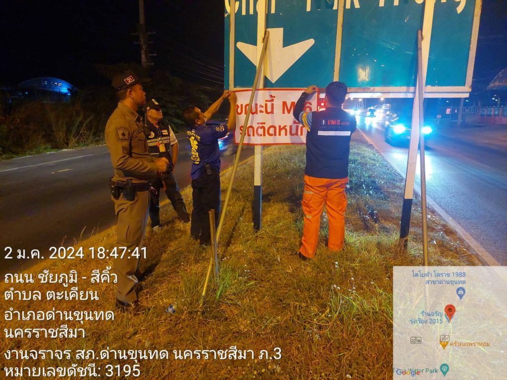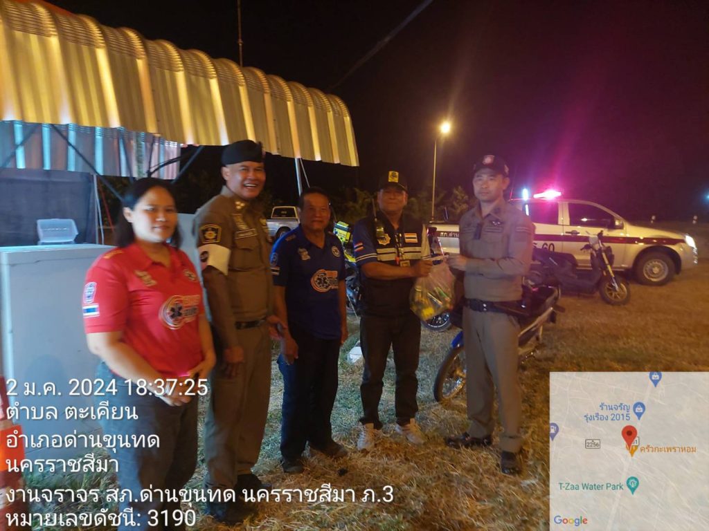 เวลา 19.10 น. พ.ต.อ.เสกสรร บุญยรัชนิกร ผกก.สภ.ด่านขุนทด สั่งการให้ พ.ต.ท.อาคม ชุดขุนทด รองว ผกก.ป.สภ.ด่านขุนทด พร้อมด้วย จราจร ตรวจเยี่ยมชุดหน่วยกู้ชีพ อบต.ตะเคียน มอบเครื่องดื่ม และติดป้ายประชาสัมพันธ์ รถติดทางด่วน M6 ให้หลีกเลี่ยงการใช้เส้นทางดังกล่าว