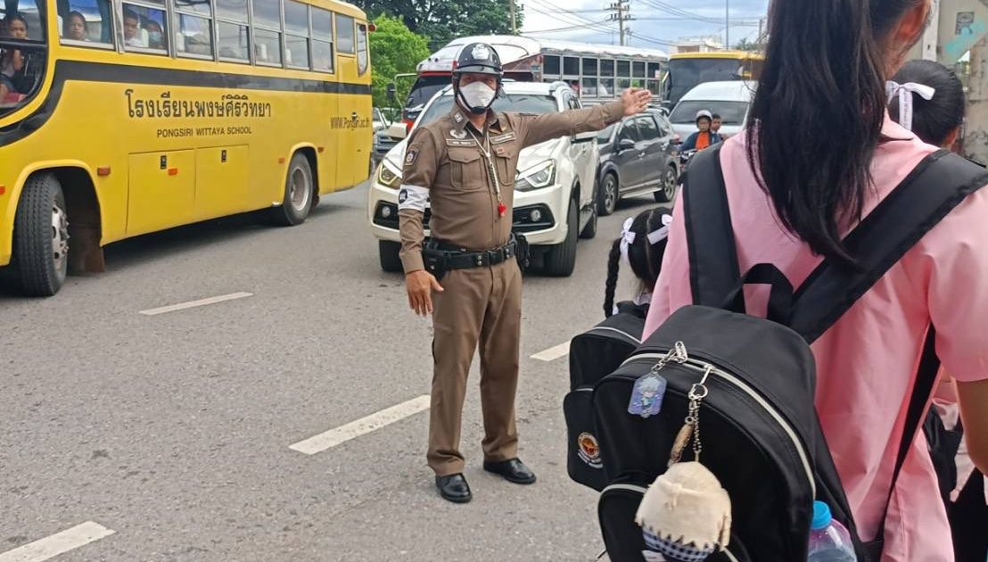 อำนวยความสะดวกการจราจรหน้าสถานศึกษาและในเขตเทศบาลตำบลด่านขุนทด ช่วงชั่วโมงเร่งด่วน การจราจรเคลื่อนตัวได้ดีตามสัญญาณไฟและสัญญาณมือ