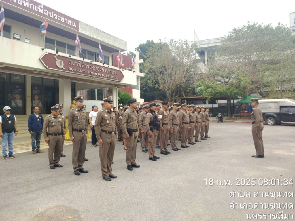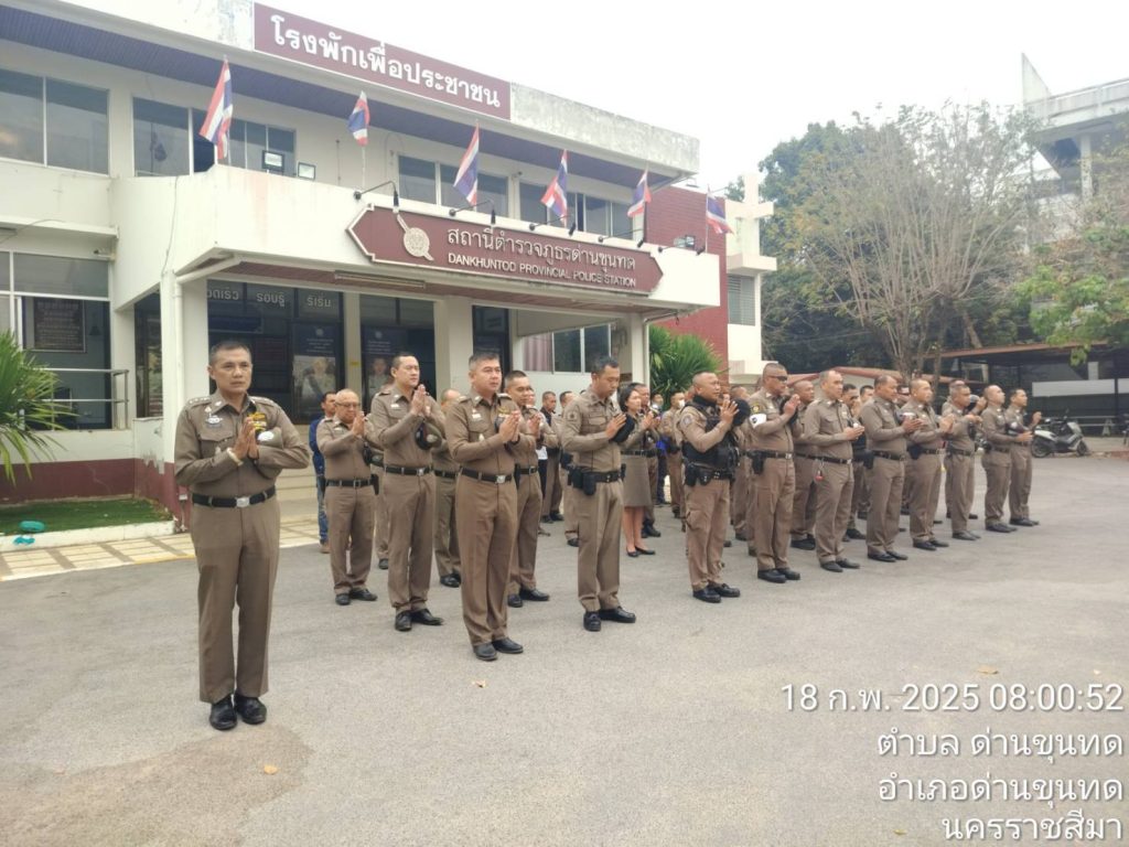 วันที่ 18 ก.พ. 2568 เวลา 08.00 น. พ.ต.อ.เสกสรร บุญยรัชนิกร ผกก.สภ.ด่านขุนทด พร้อมด้วยข้าราชการตำรวจ สภ.ด่านขุนทด เข้าแถว เคารพธงชาติ สวดมนต์ไหว้พระ กล่าวอุดมคติตำรวจ จากนั้นได้กำชับการปฏิบัติหน้าที่แก่ข้าราชการตำรวจแต่ละแผนกงาน ตามนโยบายของสำนักงานตำรวจแห่งชาติ และ กำชับการปฏิบัติหน้าที่ของทุกแผนกงาน ห้ามมิให้มีการเรียกรับสินบน กระทำการทุจริตในการปฏิบัติหน้าที่โดยเด็ดขาด